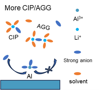 2. 阴离子DFOB-的强配位能力可有效降低电解液中游离阴离子的浓度,形成接触离子对和聚集体结构,这些结构与Al3+的络合物比溶剂分离离子对更容易在铝箔表面沉积。