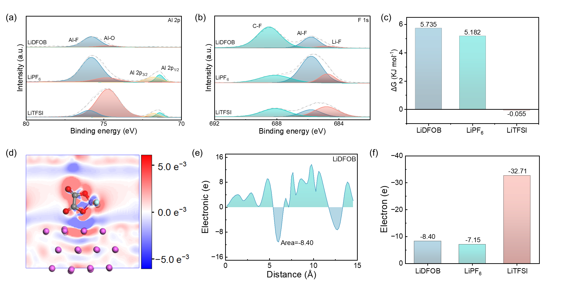 3. 由于阴离子DFOB-具有高结合亲和力,它倾向于与阳离子(包括Li+和Al3+)形成强相互作用,能抑制铝的进一步腐蚀,并展现出优异的电池性能。