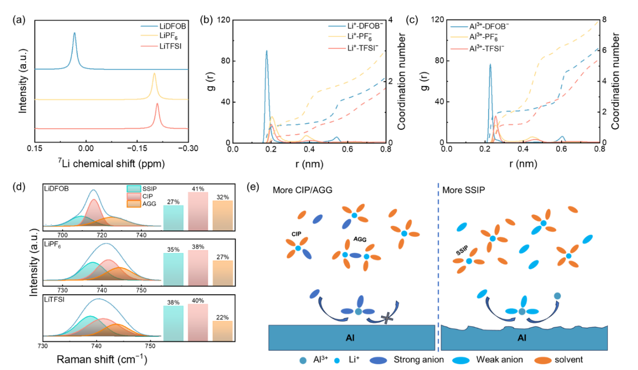 (a)7Li的核磁光谱;(b,c)Li+和Al3+的径向分布函数图;(d)拉曼光谱用于解卷积不同锂盐溶液中的溶剂化结构;(e)阴离子配位强度介导的抑制铝腐蚀机理图。